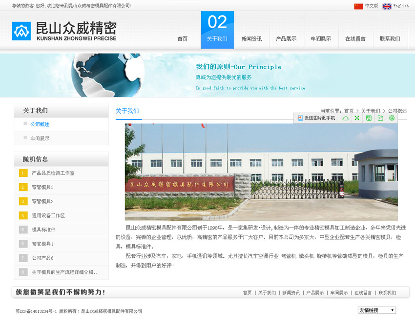 昆山眾威精密模具配件有限公司創于1998年,是一家集研發設計,制造為一體的專業精密模具加工制造企業,多年來憑借先進的設備,完善的企業管理,以優質,高精密的產品服務于廣大客戶。目前本公司為多家大,中型企業配套生產各類精密模具,檢具,模具標準件。 配套行業涉及汽車,家電,手機通訊等領域。尤其擅長汽車空調行業 彎管機 墩頭機 旋槽機等管端成型的模具,檢具的生產制造,并得到用戶的好評!